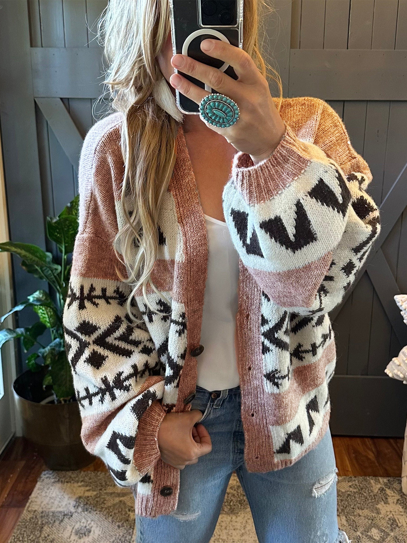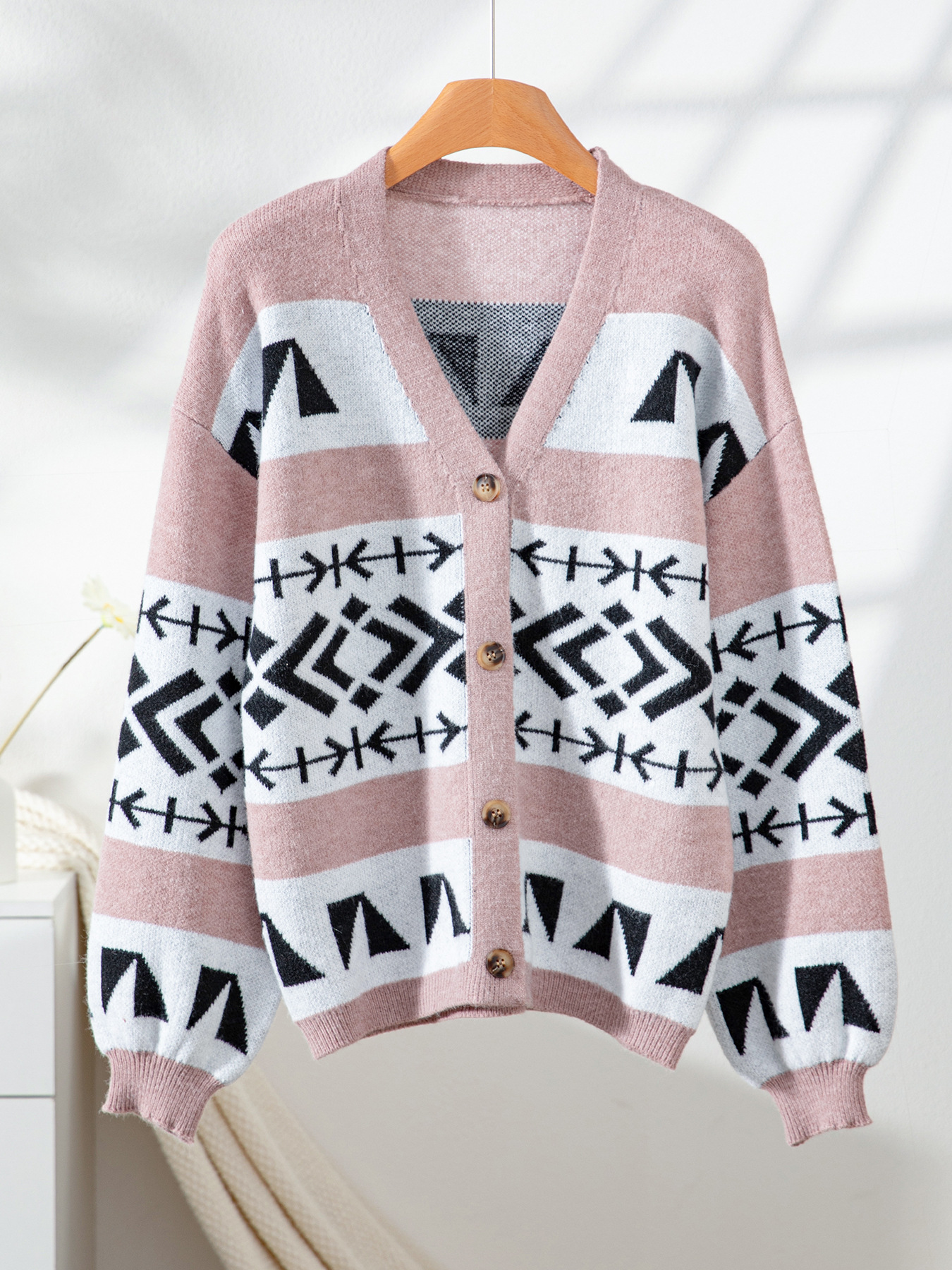 Cardigan in maglia lavorata da donna con motivo geometrico jacquard e dettagli a color block per un look moderno e alla moda. La vestibilità morbida garantisce comfort, mentre il design aperto frontale lo rende versatile per creare outfit a strati. Realizzato in morbida miscela di lana, acrilico e poliestere, ideale per mantenere calore nelle giornate fresche.