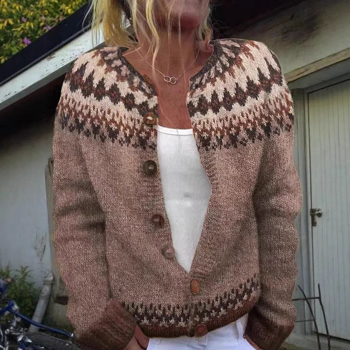 Cardigan in maglia jacquard etnico da donna dallo stile retrò e boho, perfetto per aggiungere personalità e calore a qualsiasi outfit, sia come capospalla leggero che come maglieria da interno.
