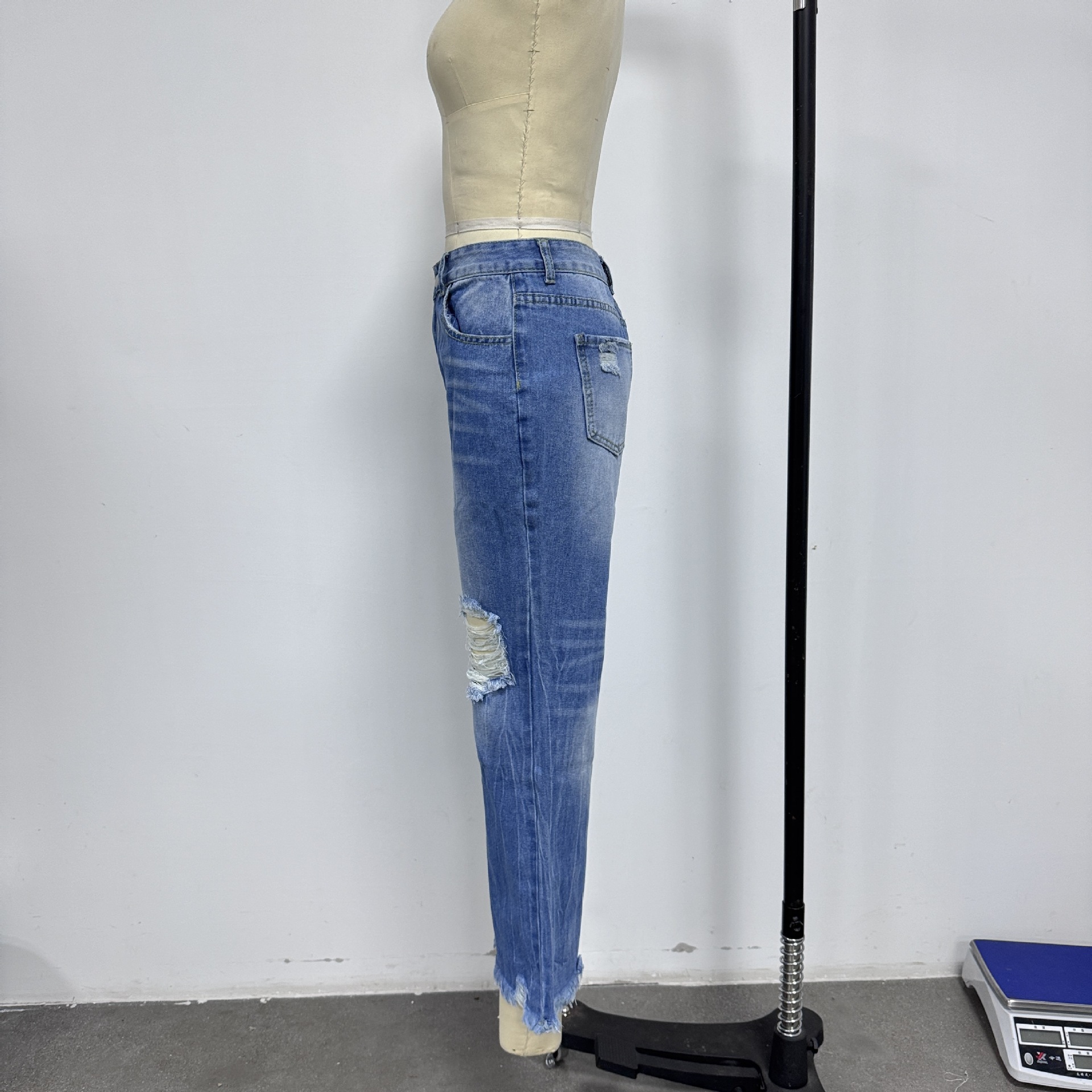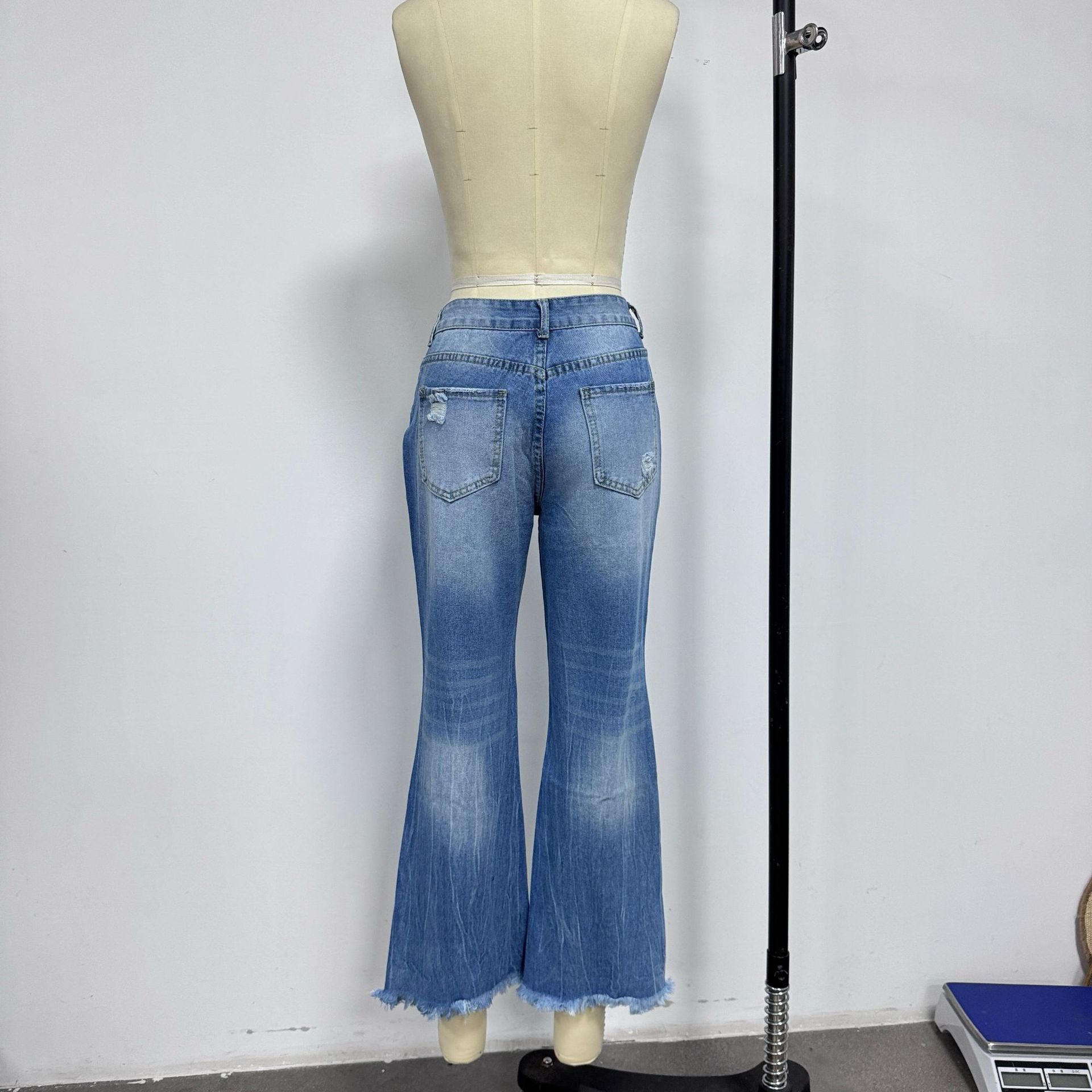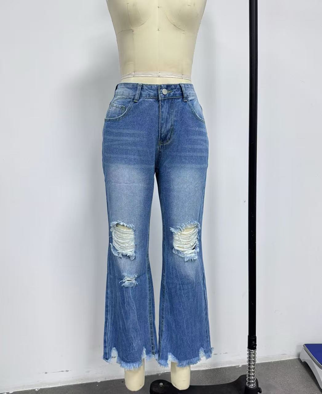 Jeans a gamba larga dal look moderno e grintoso, caratterizzati da strappi strategici e frange decorative per un effetto boho-chic. Il denim washed garantisce un aspetto vintage e una sensazione morbida al tatto, mentre il taglio wide leg offre comfort e libertà di movimento. Disponibile in taglie dalla S alla XXL per una vestibilità inclusiva.
