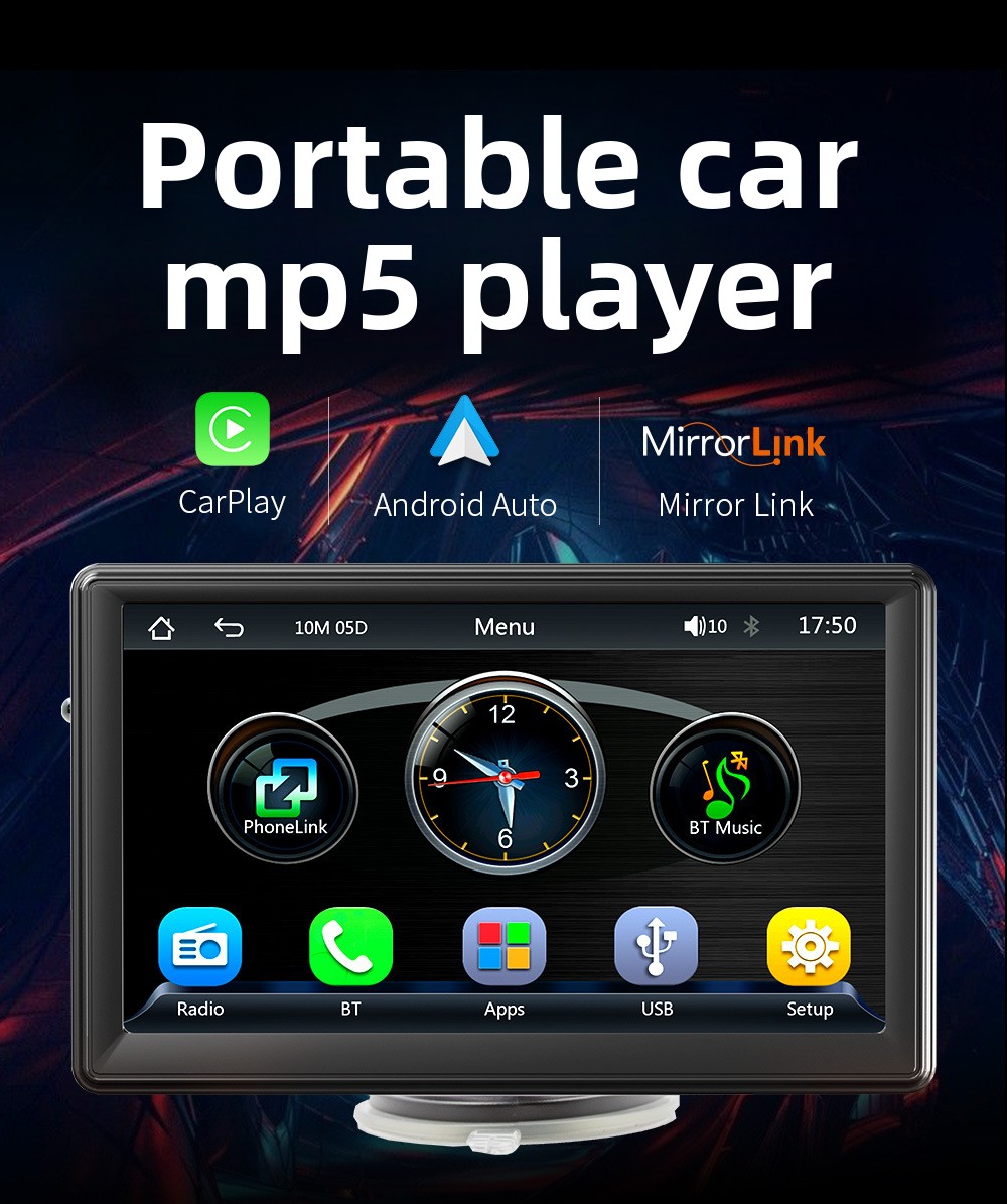 Schermo Auto Portatile 7” Touch con Apple CarPlay – Bluetooth, MP5, Mirror Screen, Ingresso Retrocamera, 4×60W, Alimentazione Accendisigari (Universale)