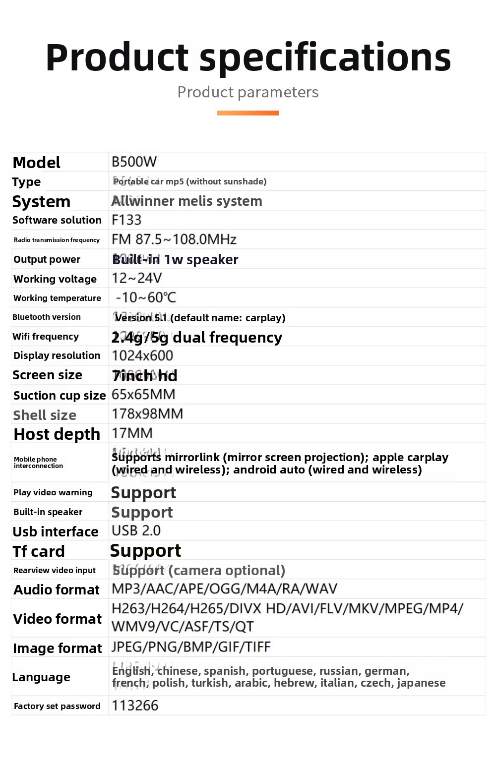 Funzioni: B500W, CarPlay, immagine retrocamera, proiezione schermo (mirror screen), MP5