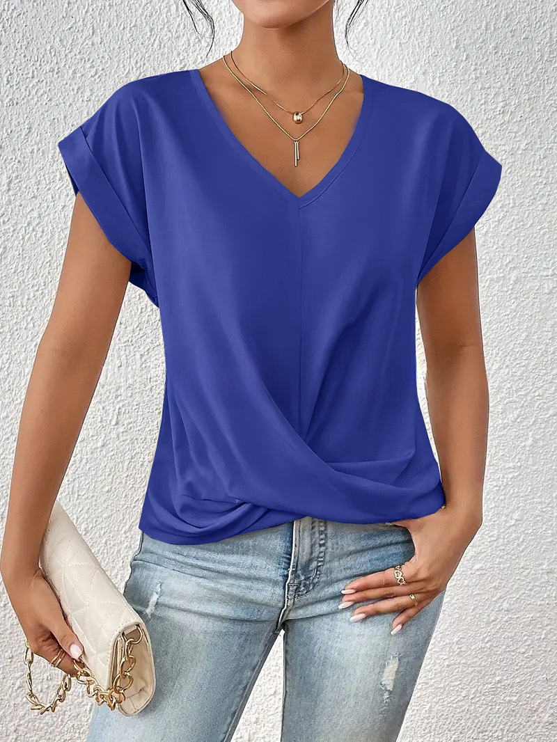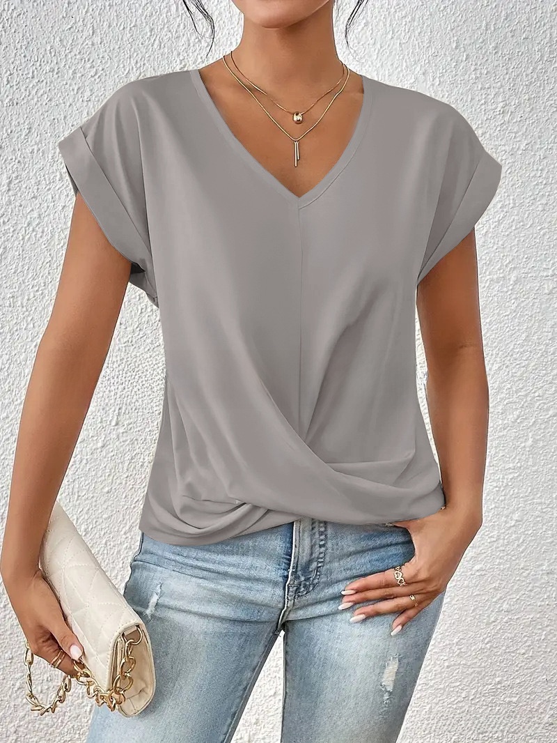 Maglietta da donna a scollatura a V in tessuto morbido e resistente, realizzata con poliestere 90–95% per un comfort duraturo. Il taglio slim fit valorizza la silhouette, mentre le pieghe aggiungono un tocco moderno e raffinato. Versatile e adatta sia per look casual che professionali.